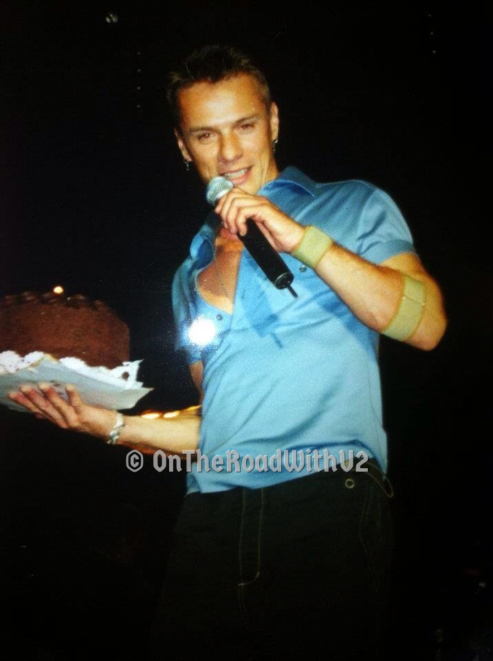 Standing at the front rail between Bono and Adam, Tasha, Paola and I wore our “Larry Mullen Band” shirts Paola had made for us. I held up the birthday card for Larry as U2 walked on stage, but I don’t think Larry saw it. There were many signs that night including one saying, “Bono let Larry sing,” but that did not happen. During “Elevation,” Bono sang, “Celebration” then said, “Happy Birthday.” After “Stuck in a Moment,” Larry’s 40th birthday celebration began.