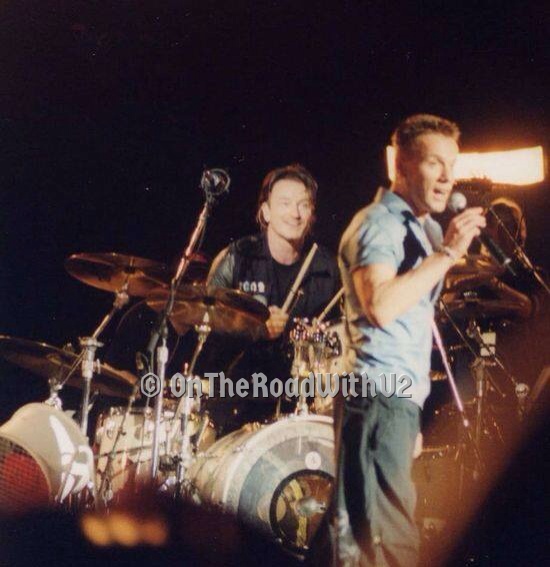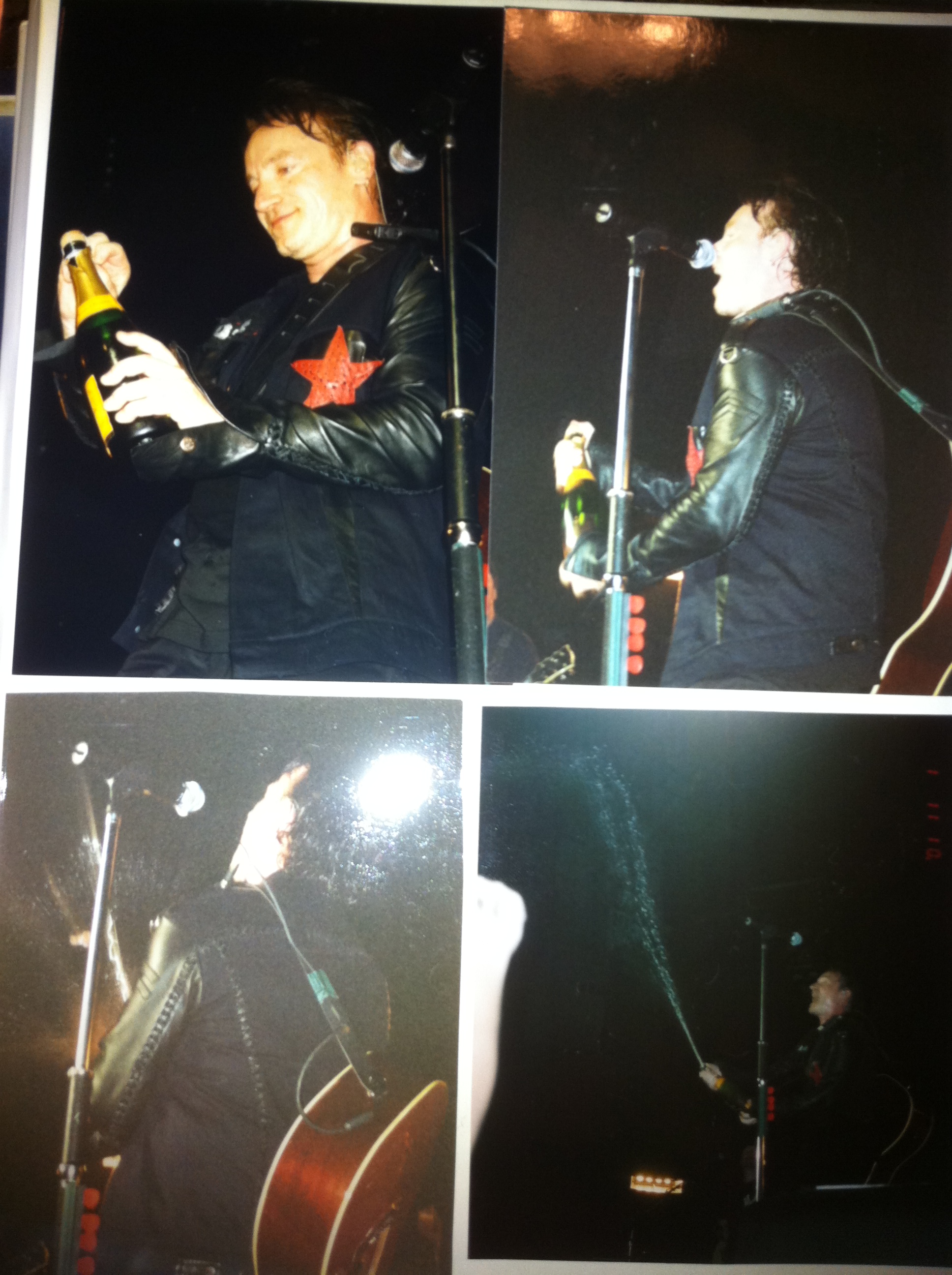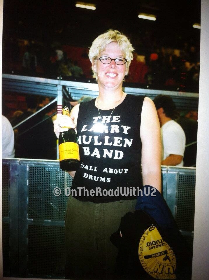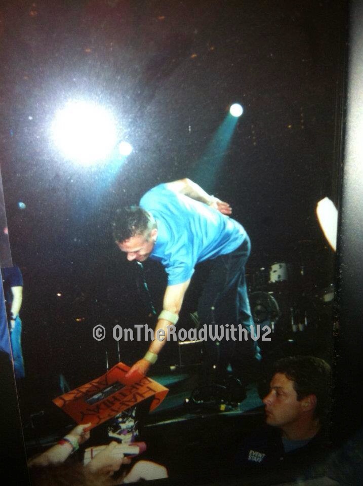 I have had many great concert moments with Larry in the past 14 years since this show, but still that Providence2 Elevation show is my favorite. There was such an unexplainable, fantastic energy that night from both the audience and the band. Granted it was Larry’s 40th Birthday, and I love Larry, but the show was also fantastic for the rarities U2 played that night. “Slow Dancing” was played for the first time on the Elevation Tour, and only the 11th time ever. “Party Girl” and “Wild Honey” were played for the first time on that leg of Elevation, and I have only heard those songs a couple of times ever. I still have that champagne bottle on my shelf, next to Larry’s drum stick he gave me in Jersey on Elevation and the drumsticks he gave me in Denver on Innocence + Experience.