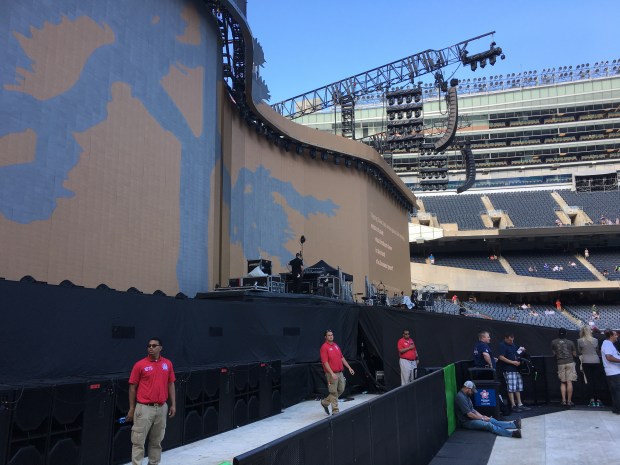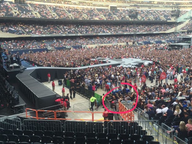 We were inside by 5:45 – just going in after the GA line was already in. We walked all the up front on the far left (Edge side) on the outside of the Red Zone. We had a great view of the main stage, the huge b (Joshua Tree shaped) stage and the video screens (Larry was on the screen facing us). Plus we had a rail to lean on – and saw some VIPs go back stage. The Lumineers took the stage at 7:30 and played until about 8:25 – they are not my cup of tea.