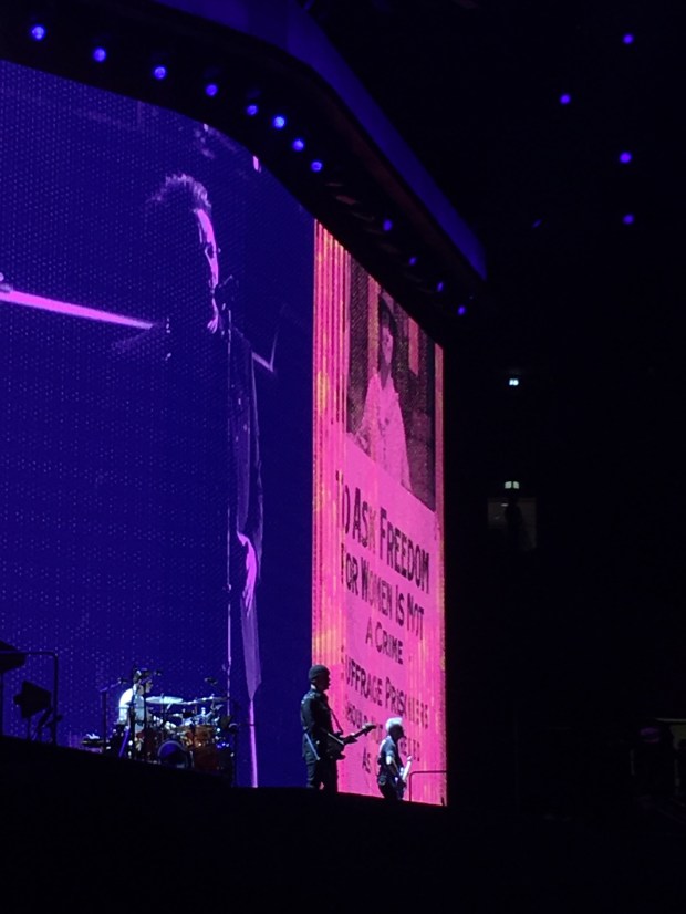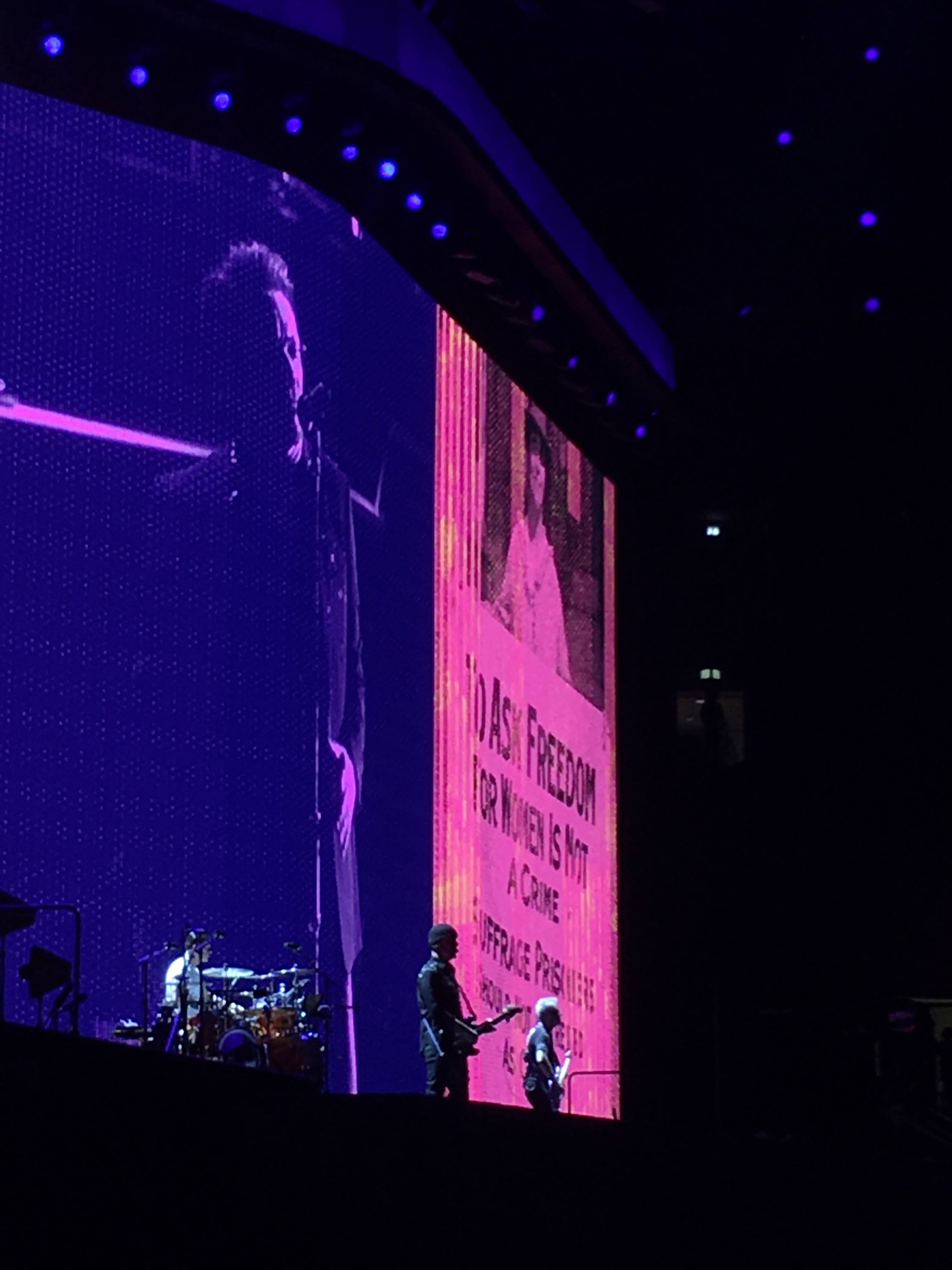 “Ultra Violet” was a tribute to women complete with famous women and the feminist movement on the video screens. I am pretty sure Bono is more of a feminist than most women, and I love him for that! “One” included the extra ‘do you us coming Lord…’ verse and the ZooTv images with One in different languages and the Buffalo. U2 returned to the b stage to conclude the show with their first single “I Will Follow.”