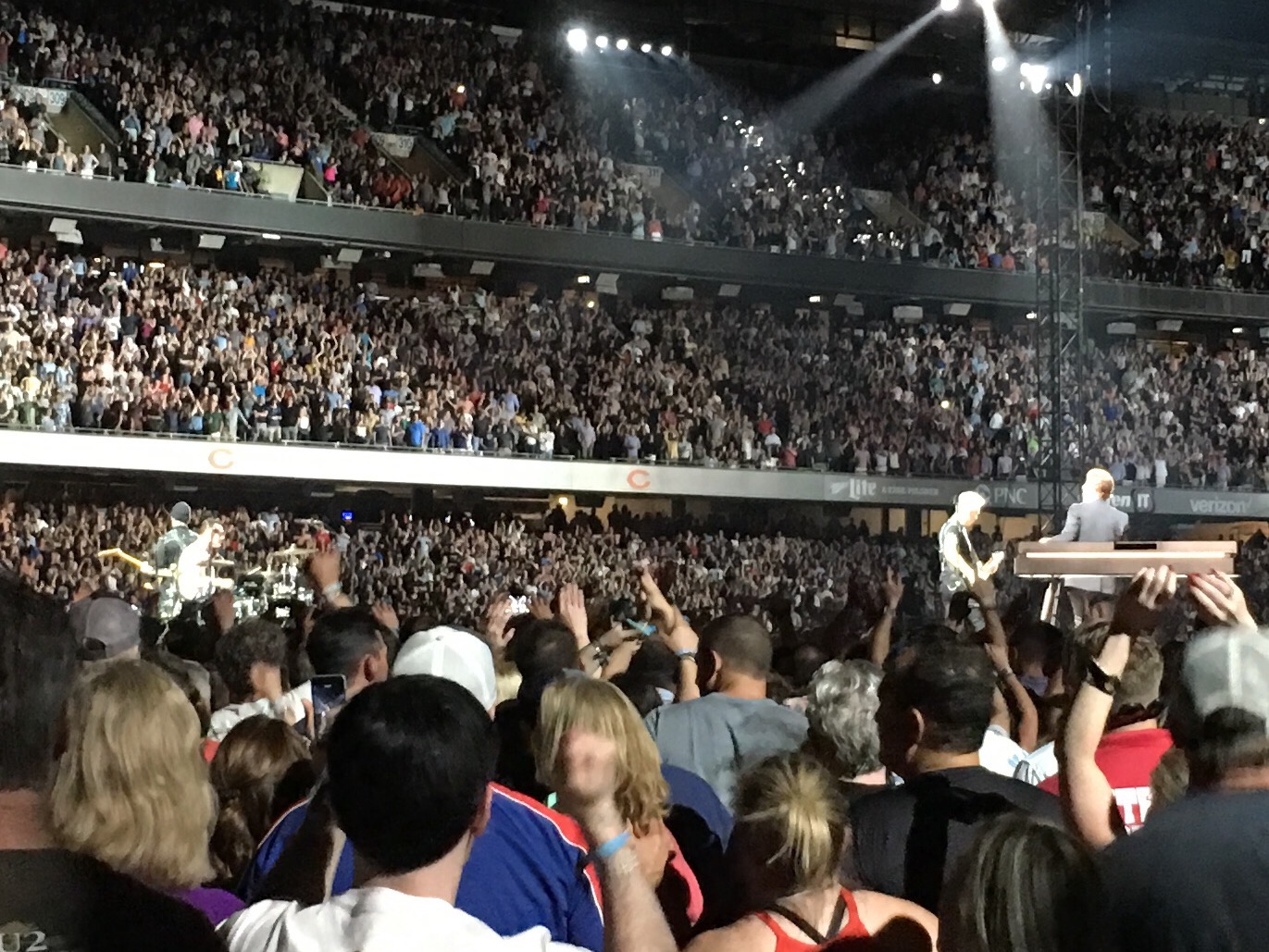 I think this may be the first concert of the 91 U2 shows I have been to the past 25 years where they did not play “Mysterious Ways.” Also I think this was the first time I have not seen Larry and Adam leave the stage for Bono and Edge to do an acoustic duet. Keep the rhythm section on stage! Larry and Edge were having a blast tonight, especially Edge. The Edge was dancing and twirling and jumping like it was 2001. Bono was struggling a bit with his voice and drinking lots of water.