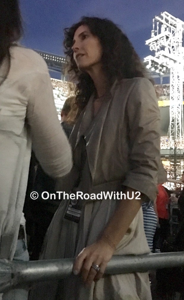 At 7:18 The Lumineers too the stage and played until 8:10 – I went to the bathroom. The GA didn’t really start filling up until 8:30 or after. Sadly Dennis Bell and some members of the New Voices of Freedom were in RedZone rather than the soundboard, so I didn’t get a chance to meet them. But I did see Edge’s wife Morleigh and actresses Gina Gershon and Carrie Lowell at the soundboard. Carrie was my favorite assistant DA on Law and Order (she was on the seasons with Benjamin Bratt). Gina Gershon was really enjoying the show – taking pics and vids and singing along.