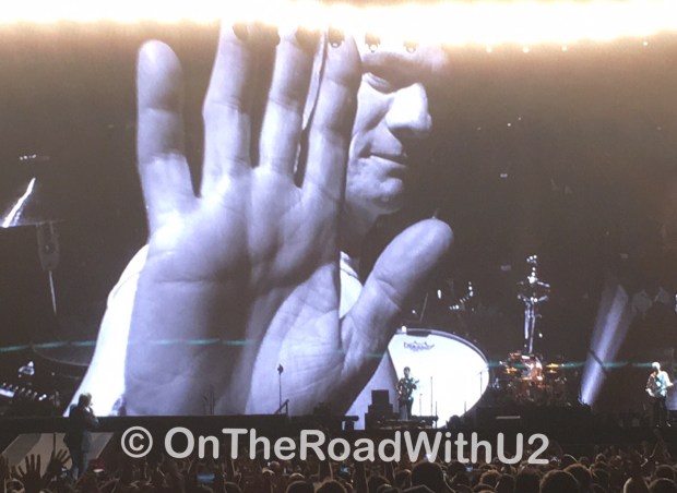 During “Trip Through Your Wires,” I watched Moreleigh watch herself on the video screen and her reactions to Bono talking about her. She was smiling and laughing the entire time – it was very endearing. Larry changed into his white tee for the the encore, but this time it said New Jersey / New York on the back. We saw it during his “Elevation” cam when he smiled and waved as Bono asked, “Who in here believes in Larry Mullen Jr? He gave us our first job, our only job.” During “Vertigo,” Bono added “it’s only rock n roll” and “rebel, rebel” snippets.