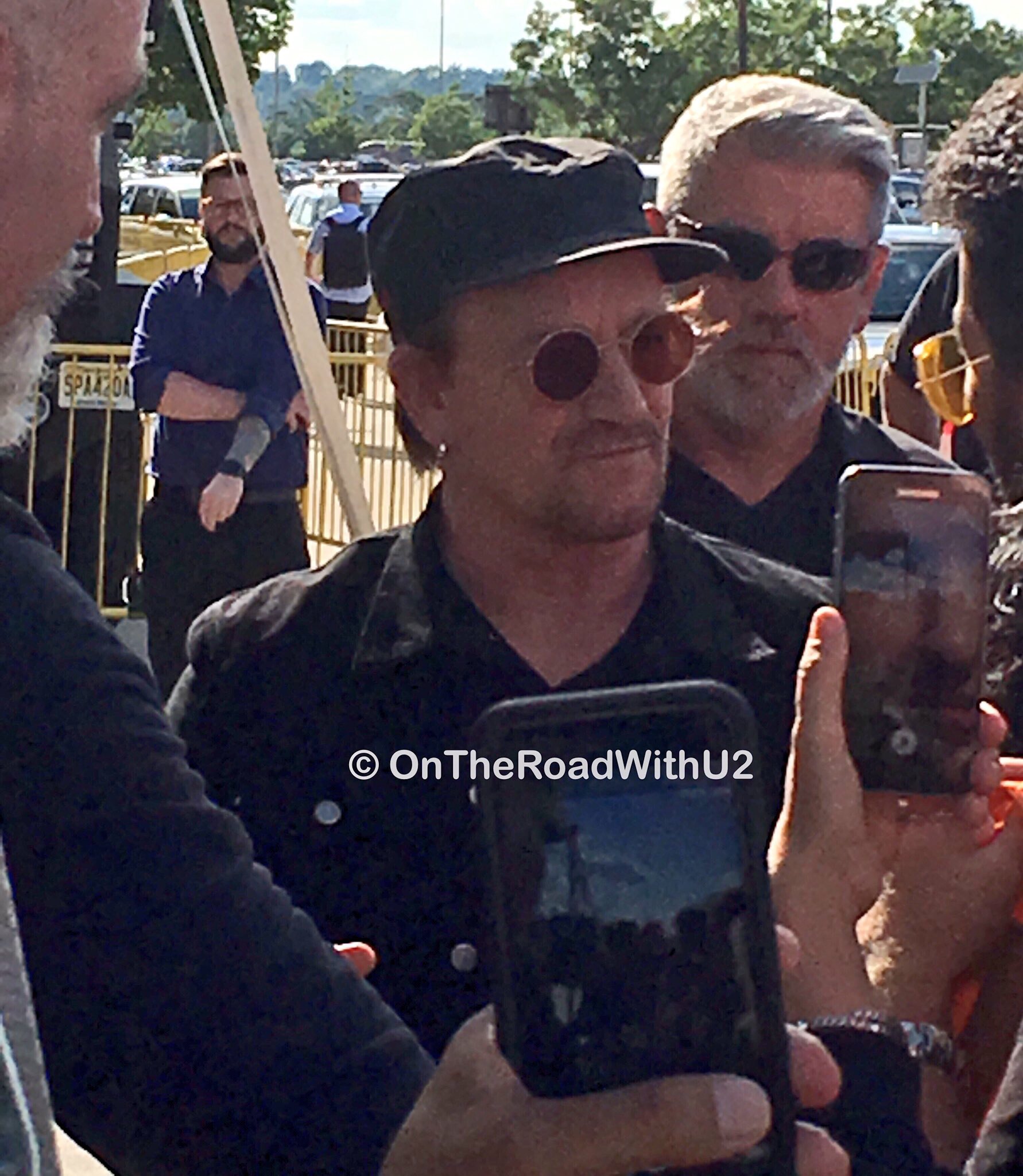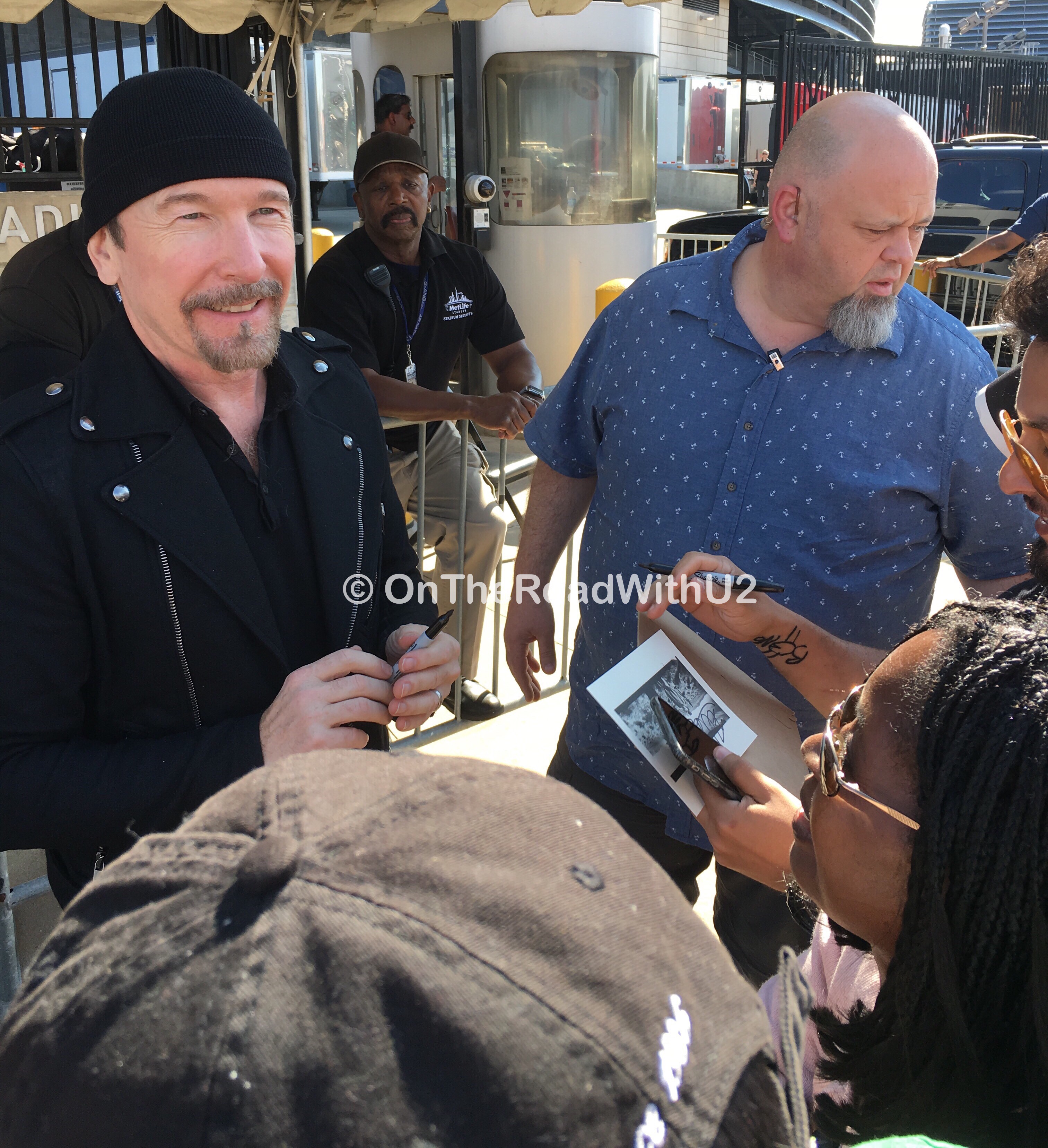 By 4:15, I was at MetLife Stadium waiting for U2 to arrive. I saw the folks from Dream Out Loud and Vicky and Romona. At 4:40 Edge drove in then walked out to greet us, sign autographs and take photos – even though we were instructed he would only shake hands. I tried to thank him for this Joshua Tree tour, but I dont think he heard me. He did respond to someone else saying they are having a LOT of fun right now! Bono drove in around 5:15 and once Brian assessed the crowd, Bono walked out to greet us. He was right in front of me but the guy next screamed and got his attention before I had a chance to say anything – and then he was gone.