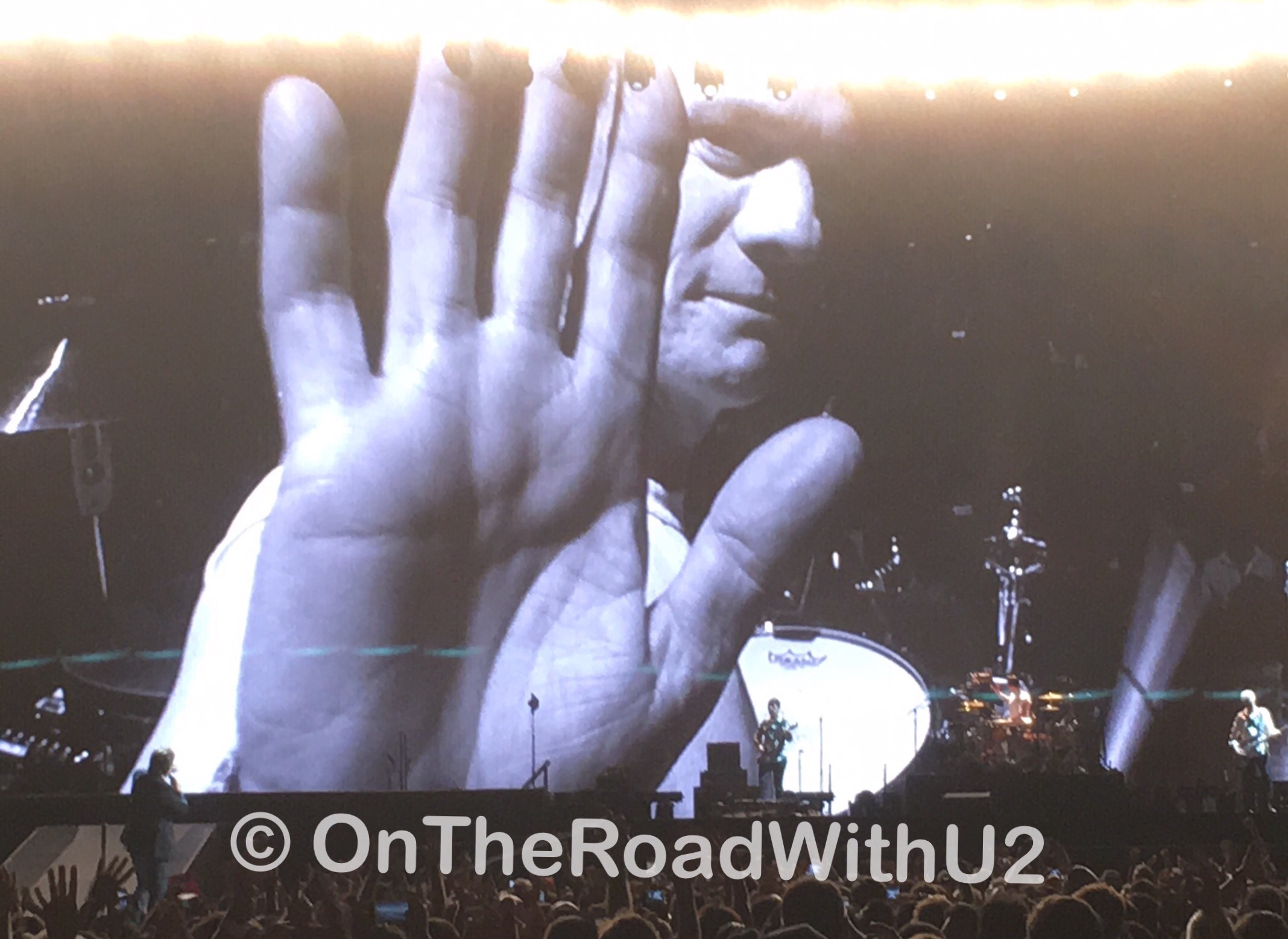 During “Trip Through Your Wires,” I watched Moreleigh watch herself on the video screen and her reactions to Bono talking about her. She was smiling and laughing the entire time – it was very endearing. Larry changed into his white tee for the the encore, but this time it said New Jersey / New York on the back. We saw it during his “Elevation” cam when he smiled and waved as Bono asked, “Who in here believes in Larry Mullen Jr? He gave us our first job, our only job.” During “Vertigo,” Bono added “it’s only rock n roll” and “rebel, rebel” snippets.